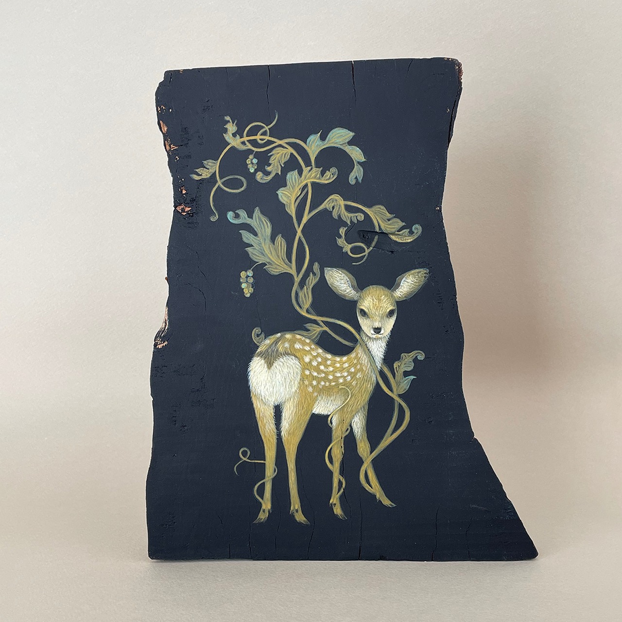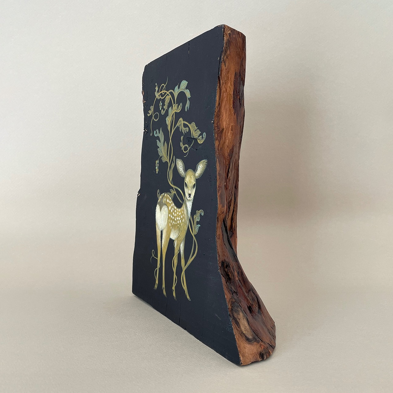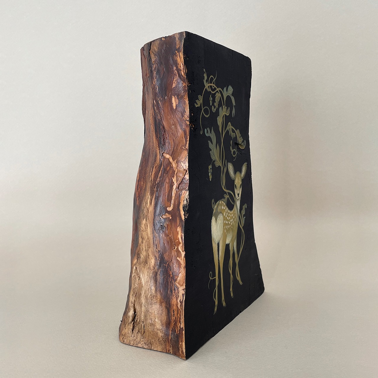 豊かな木の質感と、幻想的な絵画とのコラボレーション