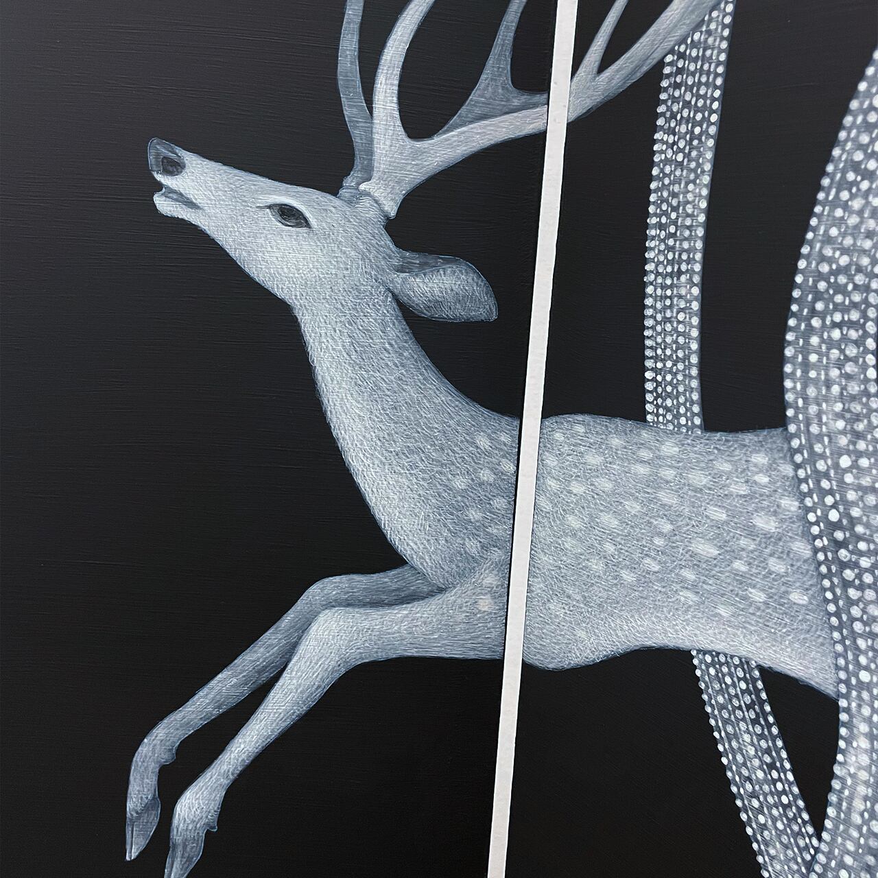 知恵の実である林檎の樹間を跳び抜け、聖なる地を求める様を描きました。